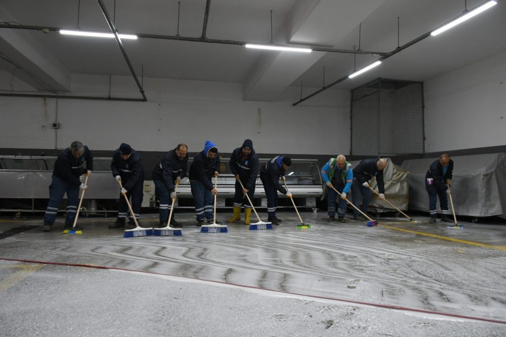 Bereketli bir gün geçirmenin verdiği mutlulukla pazarcı esnafının tezgahlarını toplamasının ardından Kapalı Pazar Yerinde bu kez Kuşadası Belediyesi Temizlik İşleri Müdürlüğü’nün yoğun mesaisi başlıyor. Özel bir ekiple Kapalı Pazar Yerine gelen Temizlik İşleri Müdürlüğü, ilk önce çevrede kalan sebze meyve ve diğer atıkları topluyor. Daha sonraysa her kat özenle süpürülüp, köpüklü sıcak suyla yıkanarak dezenfekte ediliyor. Gece geç saatlere kadar süren hummalı çalışmada Kapalı Pazar Yeri, Kuşadalıların sağlıklı ve hijyenik bir ortamda alışveriş yapabilmeleri için yeniden hazır hale getiriliyor.
