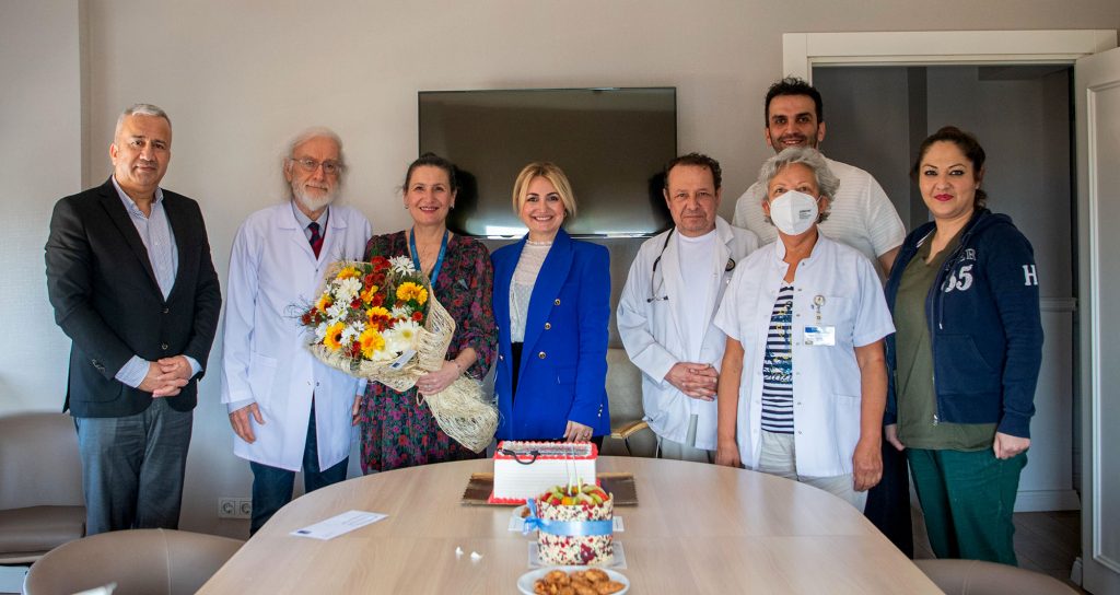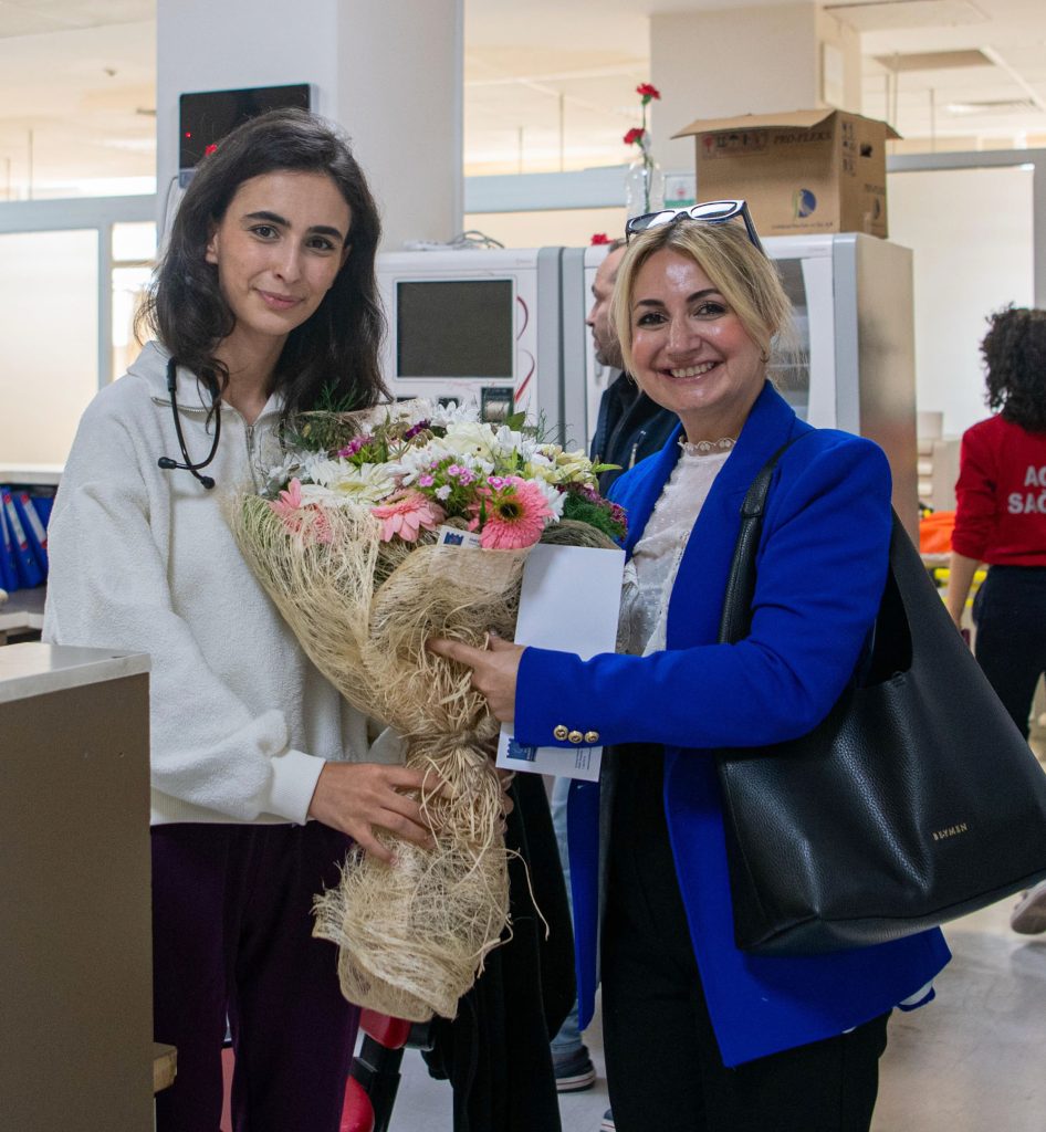 Sağlık emekçilerine, özel olarak hazırlanan pasta ve çiçeklerini veren Göğez ve Şenol, gecesini gündüzüne katarak çalışan fedakâr doktor ve sağlıkçılara gösterdikleri gayret için teşekkür etti.